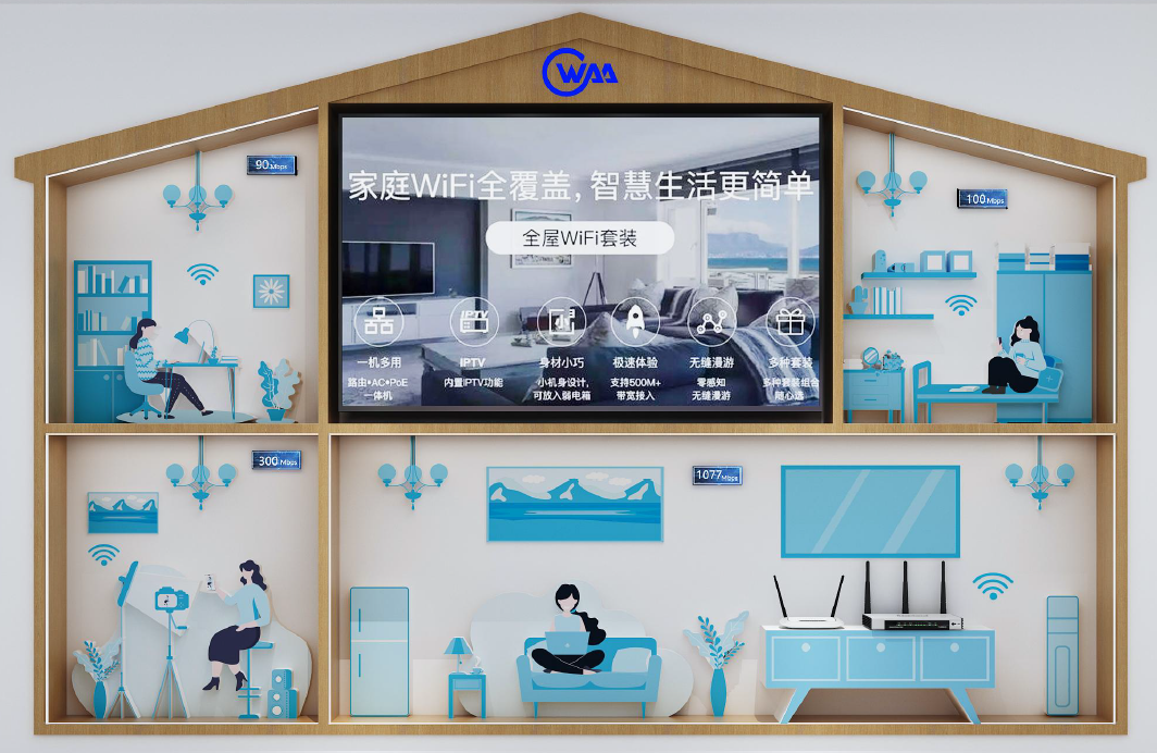 The WAA built a demonstration site that uses the "Fiber to the Room" (FTTR) deployment for experience purposes in the exhibition hall to present the performance indicators of the home network. The FTTR deployment offers high bandwidth, enabling the rapid transmission of large data streams. It also ensures low latency, allowing for quick response times in real-time applications. The network provides wide coverage, delivering wireless access to every corner of the home, along with stable connections for a consistent and uninterrupted user experience. Advanced security measures protect the home network from external threats, while the network's overall stability and reliability ensure it can continue operating under any circumstances and meet the comprehensive performance requirements in a single device scenario. Together, these features provide users with a seamless, efficient, and secure network connection experience.