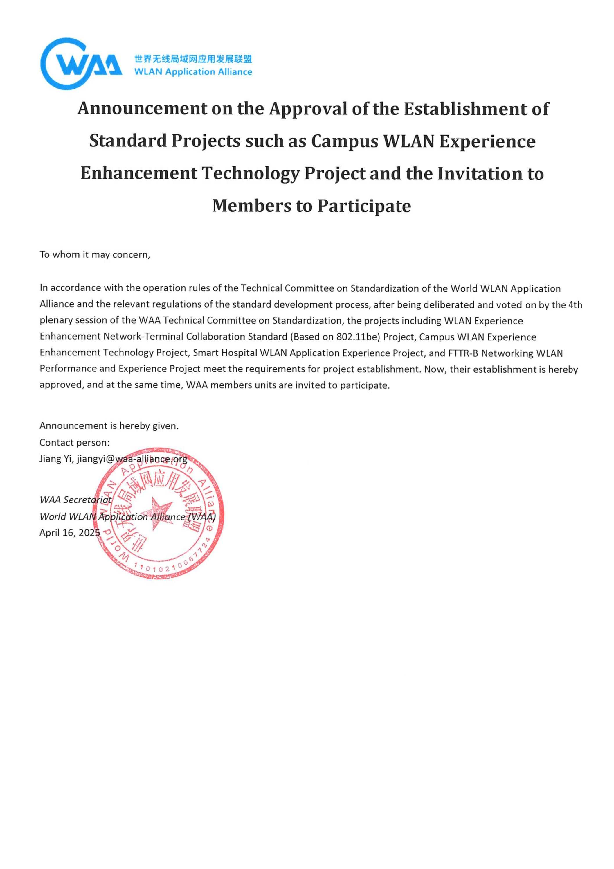 Announcement on the Approval of the Establishment of Standard Projects such as Campus WLAN Experience Enhancement Technology Project and the Invitation to Members to Participate